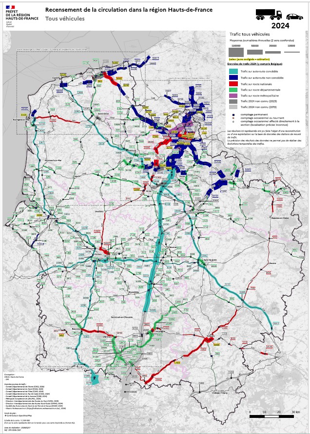 La DREAL Hauts-de-France (Direction Régionale de l’Environnement, de l’Aménagement et du Logement) publie régulièrement des cartographies détaillées des flux routiers dans la région. Les données 2024, disponibles sous forme de cartes interactives en PDF, offrent une vision actualisée du trafic moyen journalier annuel (TMJA) pour tous les véhicules et spécifiquement pour les poids lourds. Ces cartes permettent d’analyser les dynamiques de mobilité et les axes routiers les plus fréquentés.