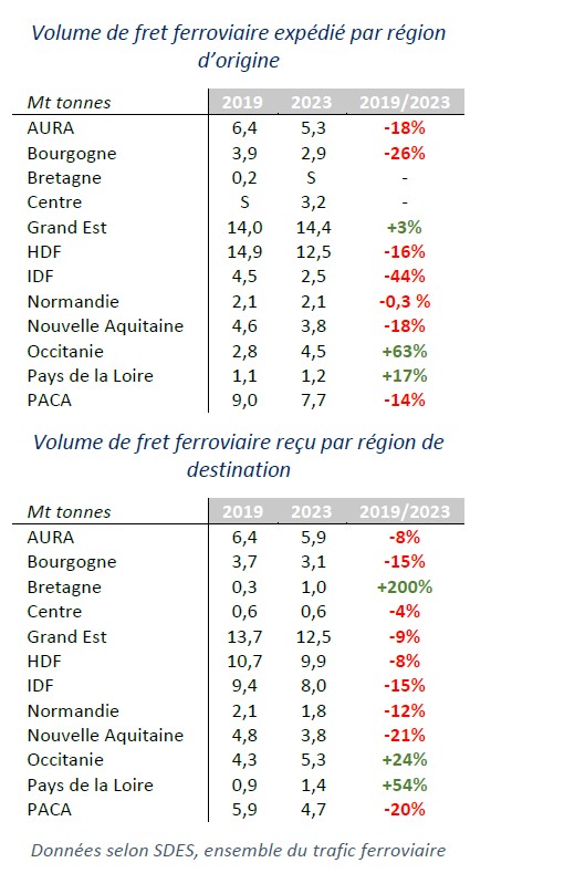 En 2023, le rail poursuit son recul dans la plupart des grands bassins en France. Les volumes restent concentrés dans le Grand Est (14,4 Mt expédiées, 12,5 Mt reçues) et les Hauts-de-France (12,5 Mt expédiées, 9,9 Mt reçues), confirmant leur rôle central.