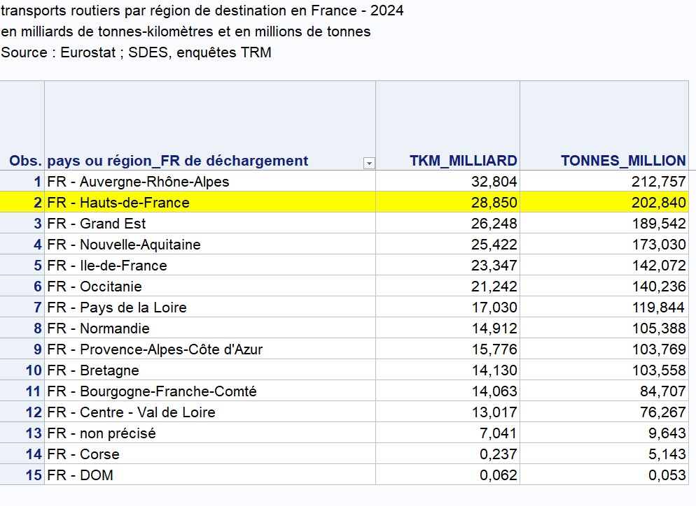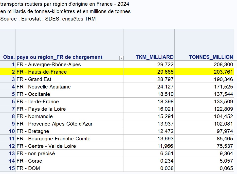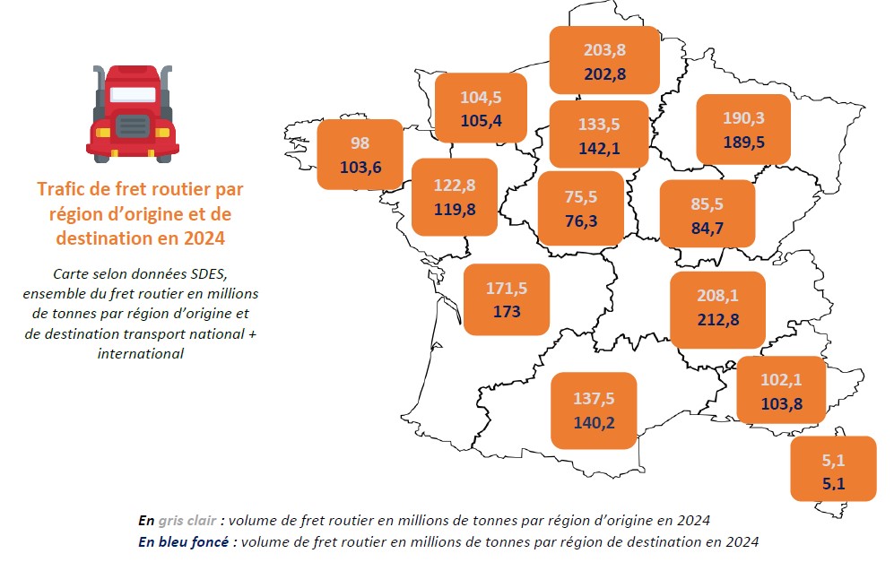 Transports routiers nationaux et internationaux par origine/destination selon la région - Données SDES France 2023